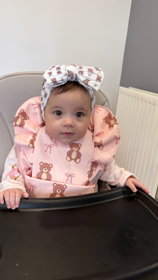 Pink Teddy Bear Bow Pattern Frill Detailed Waterproof Bib