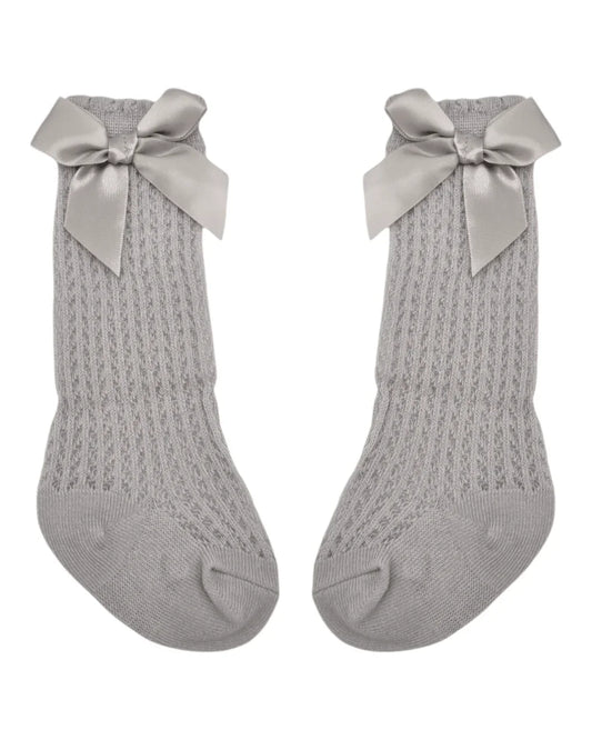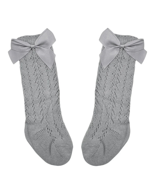 Grey Open Patterned Knee High Style Socks With 3 Inch Bow