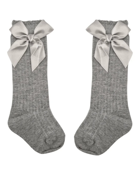 Grey Ribbed Knee High Style Socks With Satin 3 Inch Bow