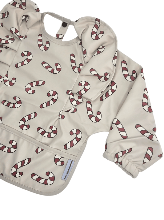 Neutral Candy Cane Christmas Pattern Frill Detailed Waterproof Bib with Sleeves