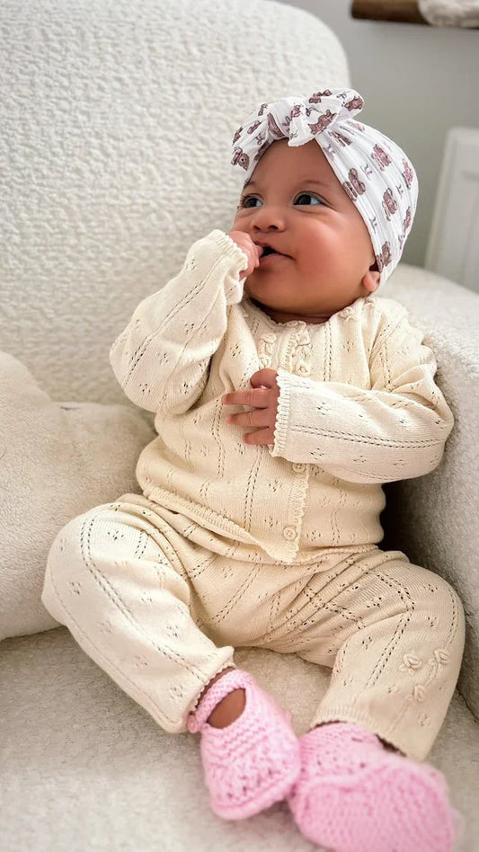 Neutral Floral Pattern Smaller Bow Cable Knit Headband