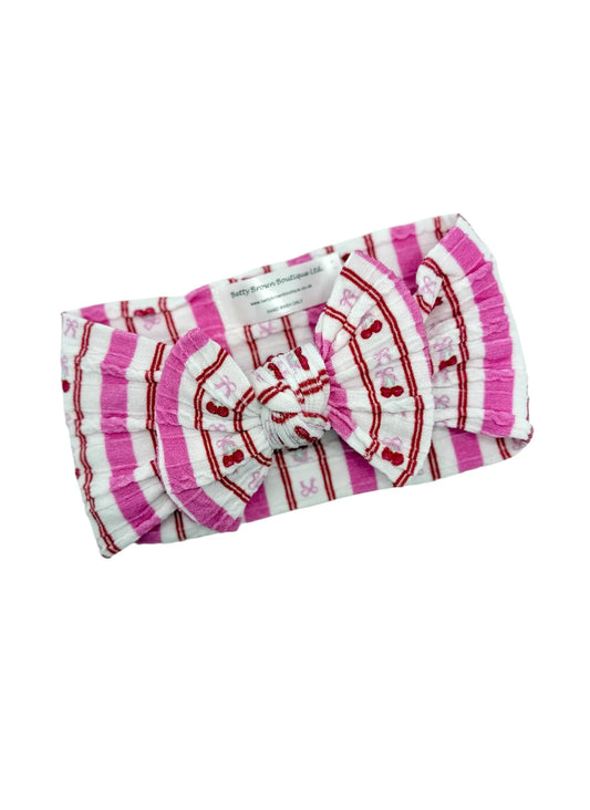 Pink Pinstripe Cherry Pattern Smaller Bow Cable Knit Headband
