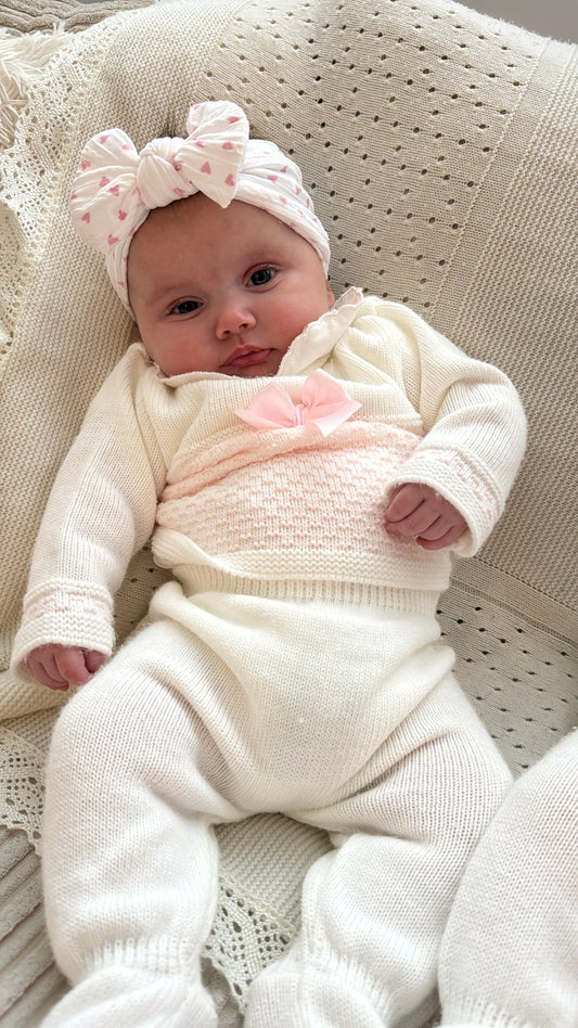 Pink and White Heart Pattern Smaller Bow Cable Knit Headband - Valentines Collection