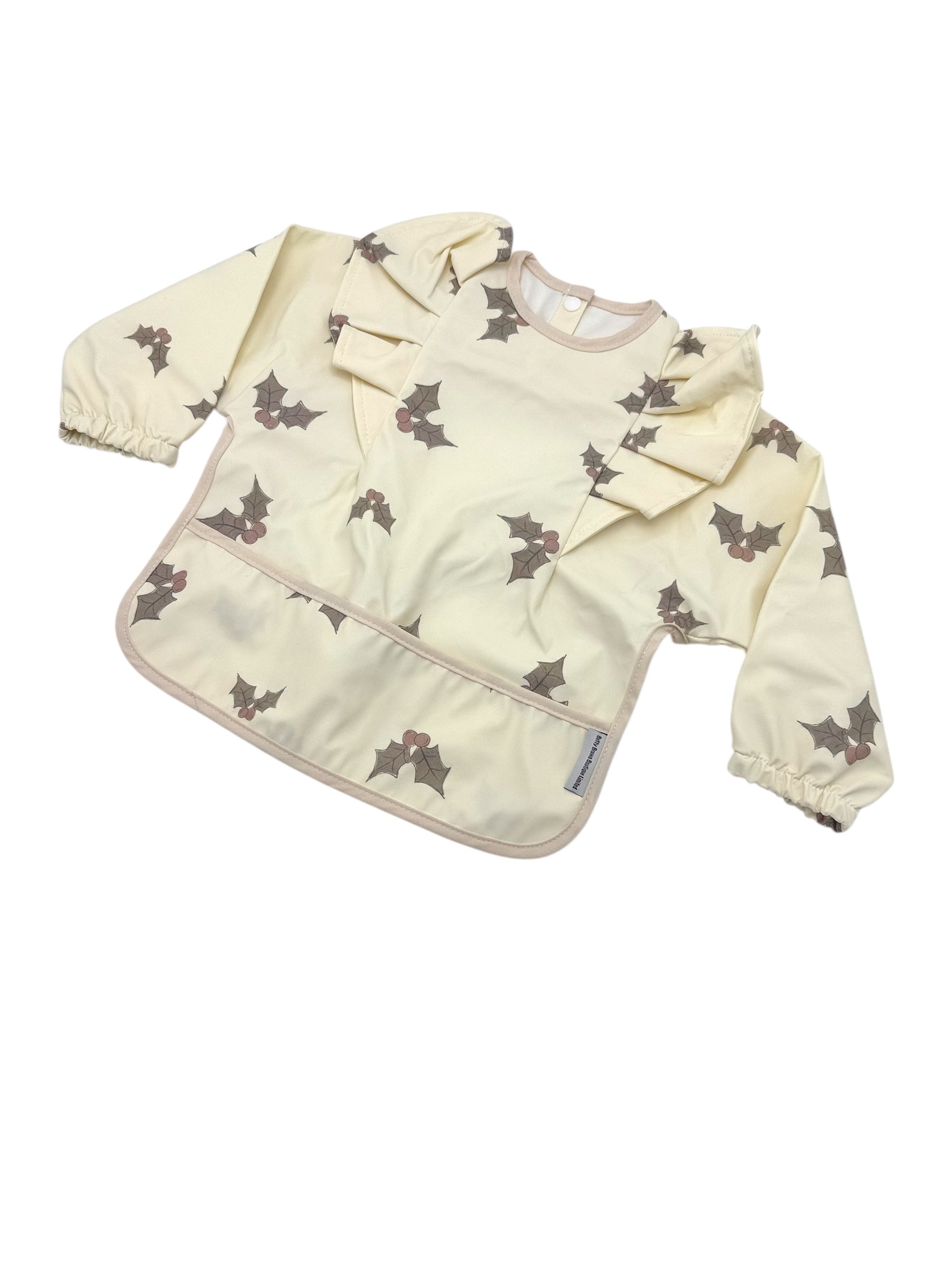 Christmas Cream Holly Pattern Frill Detailed Waterproof Bib with Sleeves