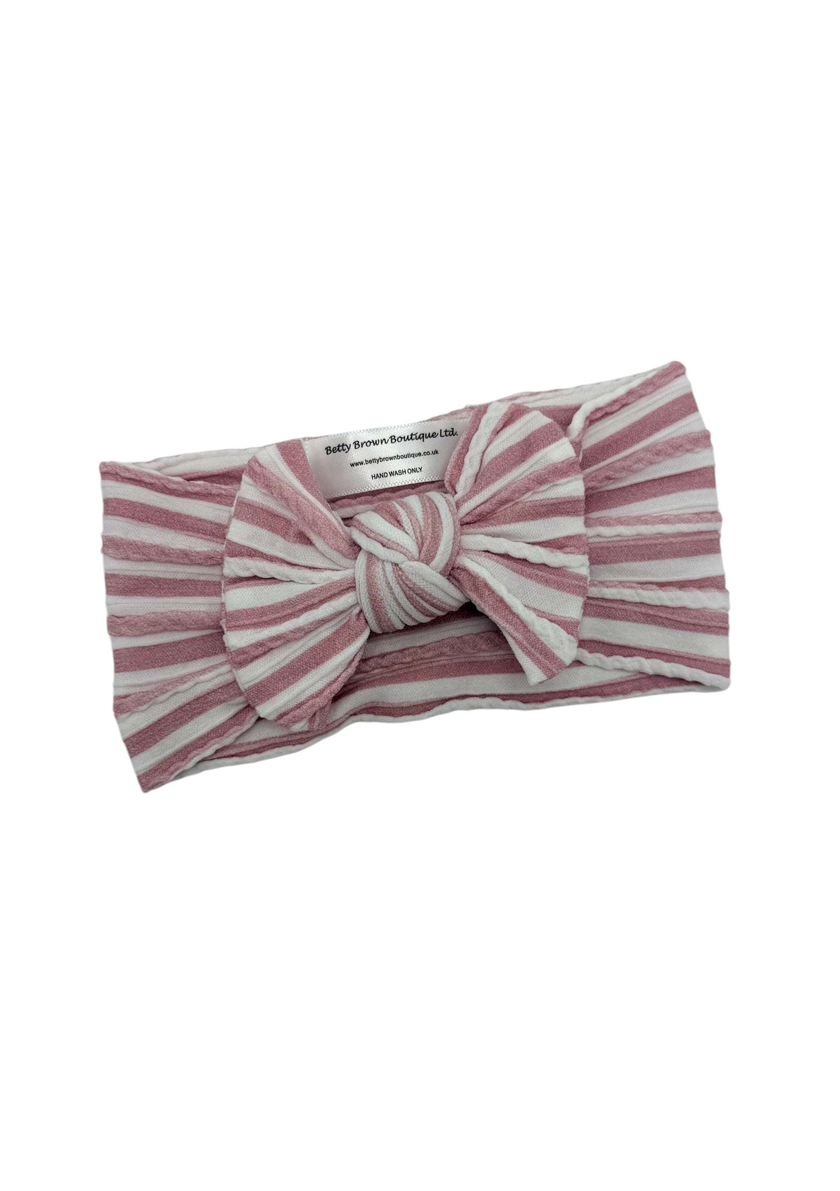 This Dusty Pink Pinstripe Print Smaller Bow Cable Knit Headband is perfect for your child's delicate head. Made from soft and stretchy nylon material, it's comfortable for long periods of wear. Suitable for newborns up to 3 years old, with a beautiful bow design. The perfect girl gift for any occasion.