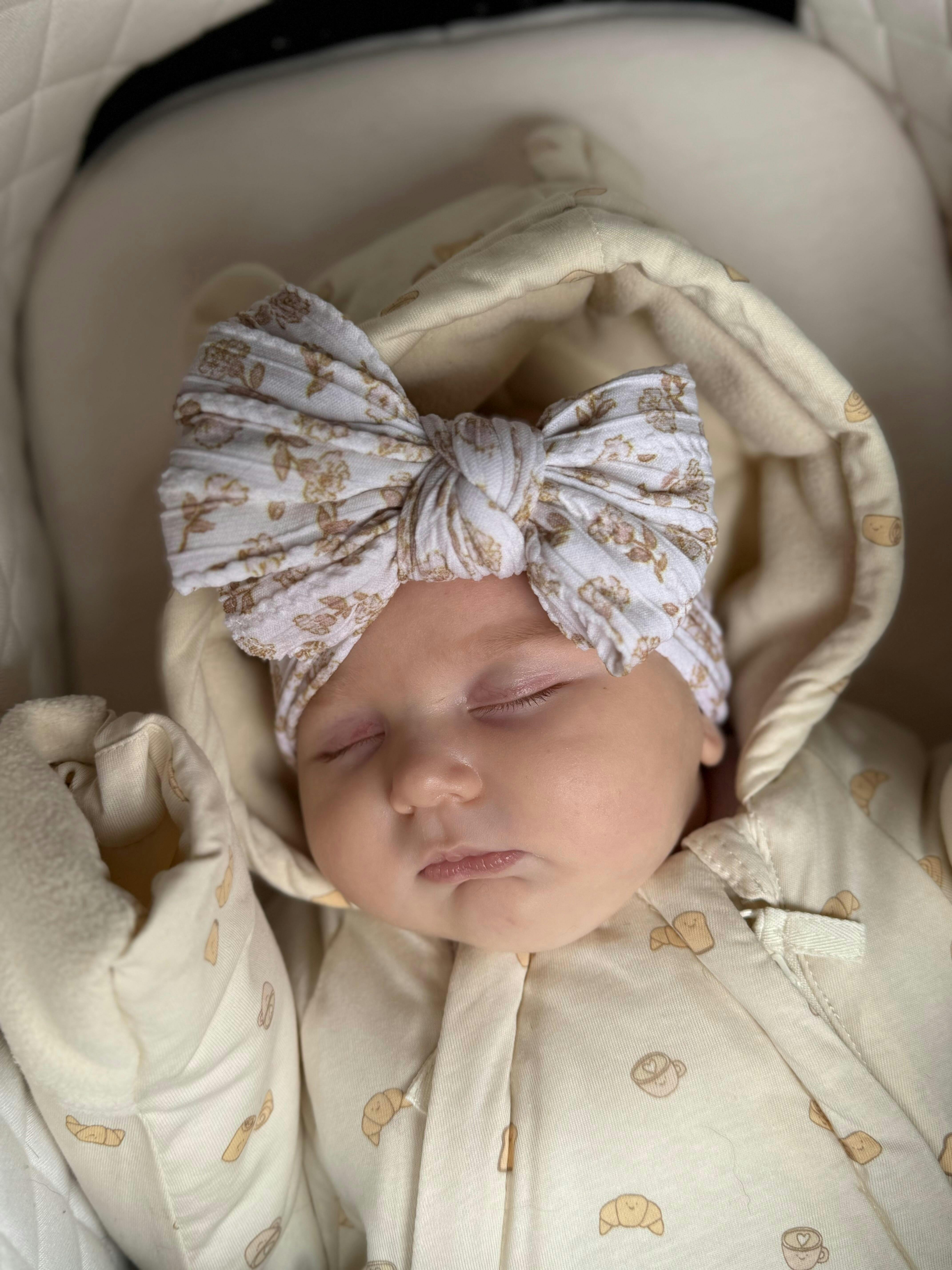 Introducing our Neutral Autumn Flowers Larger Bow Cable Knit Headband, perfect for babies and toddlers up to 3 years old. Made from soft, stretchy nylon material, that is gentle on the child's delicate head. Perfect for any occasion with its beautiful bow design. A must-have gift for any little girl.