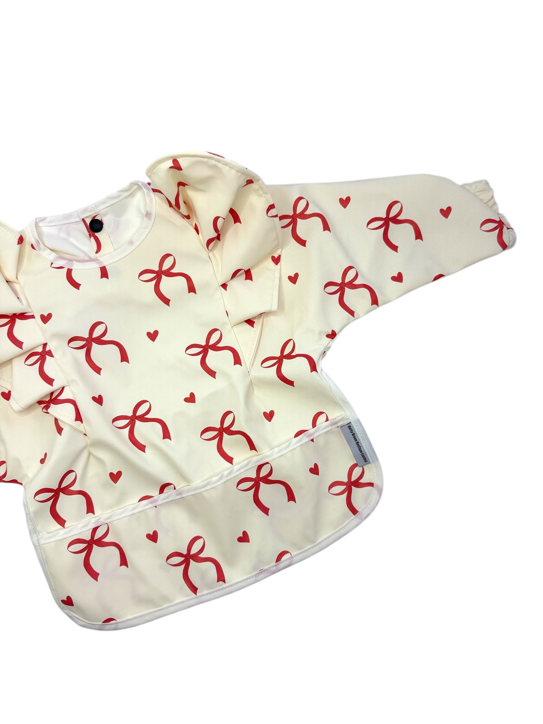 Red and Cream Bow Christmas Pattern Frill Detailed Waterproof Bib with Sleeves - 2025